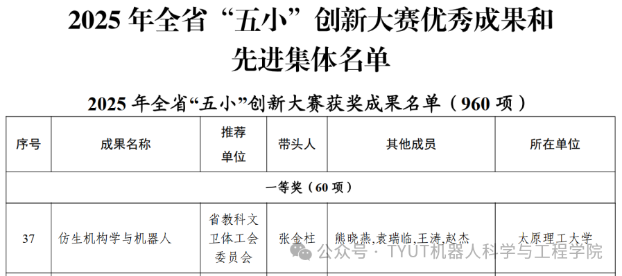 在山西省总工会、共青团山西省委、山西省科学技术协会组织的2025年全省“五小”创新大赛中,suncitygroup太阳集团张金柱副教授带头完成的《仿生机构学与机器人》项目获得优秀成果一等奖。